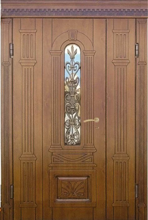 Поскольку в большинстве случаев устанавливаемые на входе в коттедж двустворчатые двери являются еще и предметом интерьера, украшающим здание, их дизайну предается особое значение. Эти двери, как правило, отделываются атмосферостойким МДФ, натуральным шпоном, массивом. Эффектно на таких дверях смотрится витражный узор, применение ковки, зеркальных элементов. Вариантов декора входной двустворчатой двери масса, тут все зависит от пожеланий заказчика.